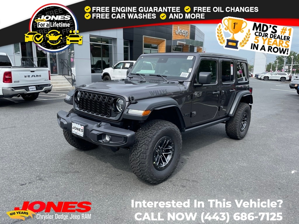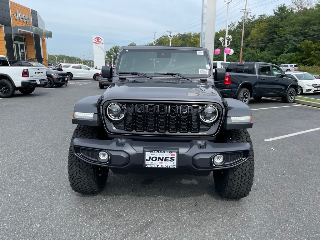 Quick Order Package 24W Willys (4-Wheel Drive Swing Gate Decal, 7 & 4 Pin Wiring Harness, 97 MPH Vehicle Max Speed Calibration, Advanced Brake Assist, Automatic Headlamps, Auxiliary Switches, Black Grille, Class II Receiver Hitch, Conventional Differential Front Axle, Corning Gorilla Glass, Dana M210 Wide HD Tube Front Axle, Dana M220 Wide Rear Axle, Daytime Running Lamps LED Accents, Deep Tint Sunscreen Windows, E-Locker Rear Axle, Enhanced Adaptive Cruise Control, Front LED Fog Lamps, Full Speed Forward Collision Warning Plus, Injection Molded Black Rear Bumper, LED Premium Reflector Headlamps, Mold In Color Bumper w/Gloss Black, Molded in Color Rubicon Highline Flare, MOPAR All-Weather Floor Mats, Off-Road Plus Mode, Power Heated Mirrors, Premium Wrapped Steering Wheel, Security Alarm, Sun Visors w/Illuminated Vanity Mirrors, Wheels: 17" x 7.5" Painted Black, Willy's Suspension, and Willys Hood Decal), Xtreme 35" Tire Package (35" Tire Suspension, Anti-Lock 4-Wheel Disc Perf Brakes, MOPAR Hinge-Gate Reinforcement, Wheel Flare Extensions, and Wheels: 17" x 8" Machined w/Black Pockets), 110 MPH Vehicle Max Speed Calibration, 4-Wheel Disc Brakes, 8 Speakers, ABS brakes, Air Conditioning, AM/FM radio: SiriusXM, Apple CarPlay/Android Auto, Aux Battery, Brake assist, Cloth Low-Back Bucket Seats, Compass, Delay-off headlights, Driver door bin, Driver vanity mirror, Dual front impact airbags, Dual front side impact airbags, Electronic Stability Control, Front anti-roll bar, Front Bucket Seats, Front Center Armrest w/Storage, Front fog lights, Front reading lights, Illuminated entry, Integrated roll-over protection, Jeep Trail Rated Kit, Low tire pressure warning, Non-Lock Fuel Cap w/o Discriminator, Normal Duty Suspension, Occupant sensing airbag, Outside temperature display, Overhead airbag, Panic alarm, ParkView Rear Back-Up Camera, Passenger door bin, Passenger vanity mirror, Power steering, Power Top Quarter Window Storage Bag, Power windows, Radio data system, Radio: Uconnect 5 w/12.3" Display, Rear anti-roll bar, Rear reading lights, Rear Window Defroster, Rear Window Wiper/Washer, Remote keyless entry, Removable Rear Quarter Windows, Sky 1-Touch Power Top, Speed control, Split folding rear seat, Steering wheel mounted audio controls, Stop-Start Dual Battery System, Tachometer, Telescoping steering wheel, Tilt steering wheel, Traction control, Trip computer, Variably intermittent wipers, and Wheels: 17" x 7.5" Black Steel Styled.