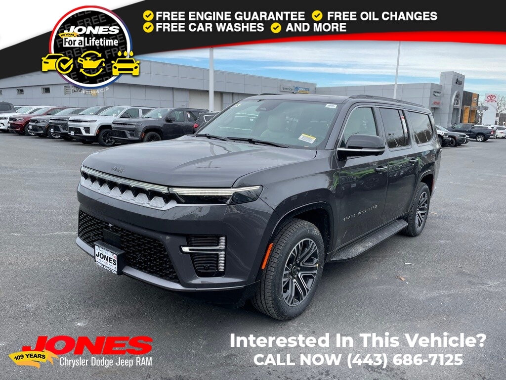 8-Passenger Seating Package (40/20/40 Row Bench Power Tip/Slide, 8-Passenger Seating, and Full Length Floor Console), Premium Group I (3 Panel Sunroof, Auto Adjust in Reverse Exterior Mirrors, Auto Power-Folding Mirrors, Auto-Dimming Exterior Driver Mirror, Auto-Power-Folding Exterior Mirrors, Exterior Mirrors Approach Lamps, Exterior Mirrors with Memory, Exterior Mirrors with Supplemental Signals, Heated Exterior Mirrors, Interior Rear Facing Camera, Luxury Front and Rear Floor Mats, P and P Park and Unpark Assist with Stop System, Reversible Carpet/Vinyl Cargo Mat, Side Distance Warning, and Surround View Camera System), Quick Order Package 29E Grand Wagoneer, 118 MPH Maximum Speed Calibration, 3.55 Rear Axle Ratio, 3rd row seats: bench, 4-Wheel Disc Brakes, 9 Speakers, ABS brakes, Air Conditioning, Alloy wheels, AM/FM radio: SiriusXM with 360L, Anti-whiplash front head restraints, Apple CarPlay/Android Auto, Audio memory, Auto High-beam Headlights, Auto-dimming door mirrors, Auto-dimming Rear-View mirror, Auto-leveling suspension, Automatic temperature control, Brake assist, Bumpers: body-color, Compass, Delay-off headlights, Driver door bin, Driver vanity mirror, Driver's Seat Mounted Armrest, Dual front impact airbags, Dual front side impact airbags, Electronic Stability Control, Emergency communication system: Jeep Connect, Exterior Parking Camera Rear, Four wheel independent suspension, Front anti-roll bar, Front Bucket Seats, Front Center Armrest w/Storage, Front dual zone A/C, Front fog lights, Front reading lights, Fully automatic headlights, Garage door transmitter, Heated door mirrors, Heated front seats, Heated steering wheel, Illuminated entry, Knee airbag, Leather Trimmed Bucket Seats, Low tire pressure warning, Memory seat, Navigation System, Normal Duty Suspension, Occupant sensing airbag, Outside temperature display, Overhead airbag, Overhead console, Panic alarm, Passenger door bin, Passenger seat mounted armrest, Passenger vanity mirror, Power door mirrors, Power driver seat, Power Liftgate, Power passenger seat, Power steering, Power windows, Radio data system, Radio: Uconnect 5 Nav with 12" Display, Rain sensing wipers, Rear air conditioning, Rear anti-roll bar, Rear reading lights, Rear seat center armrest, Rear window defroster, Rear window wiper, Reclining 3rd row seat, Remote keyless entry, Security system, Speed control, Speed-sensing steering, Speed-Sensitive Wipers, Split folding rear seat, Steering wheel memory, Steering wheel mounted audio controls, Tachometer, Telescoping steering wheel, Tilt steering wheel, Traction control, Trip computer, Turn signal indicator mirrors, Variably intermittent wipers, Ventilated front seats, Voltmeter, and Wheels: 20" x 9.0" Machine Face Painted Aluminum.