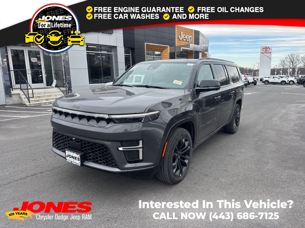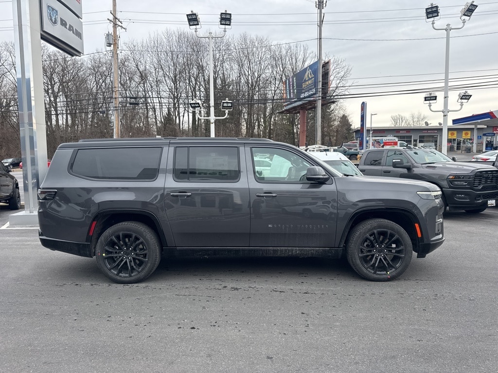 Obsidian Appearance Package, Premium Group III (Front Passenger Interactive Display, Rearview Autodim Digital Display Mirror, Reversible Carpet/Vinyl Cargo Mat, and Ventilated Rear Seats), Quick Order Package 29Z Obsidian (Black Chiseled Metal Interior Accent, Black Exterior Accents, Titanium Daylight Opening Upper, Titanium Upper Grille Applique, and Wheels: 22" x 9.0" Tinted Polished with Black Insert), Rear Seat Video Group I (Amazon Fire TV Built-in, Seatback Video Screens, and Video USB Port), 118 MPH Maximum Speed Calibration, 19 Speakers, 3.55 Rear Axle Ratio, 3rd row seats: bench, 4-Wheel Disc Brakes, ABS brakes, Air Conditioning, Alloy wheels, AM/FM radio: SiriusXM with 360L, Anti-whiplash front head restraints, Apple CarPlay/Android Auto, Audio memory, Auto Adjust in Reverse Exterior Mirrors, Auto High-beam Headlights, Auto-dimming door mirrors, Auto-Dimming Exterior Driver Mirror, Auto-dimming Rear-View mirror, Auto-leveling suspension, Automatic temperature control, Brake assist, Bumpers: body-color, Compass, Delay-off headlights, Driver door bin, Driver vanity mirror, Driver's Seat Mounted Armrest, Dual front impact airbags, Dual front side impact airbags, Electronic Stability Control, Emergency communication system: Jeep Connect, Exterior Mirrors Approach Lamps, Exterior Mirrors with Memory, Exterior Mirrors with Supplemental Signals, Exterior Parking Camera Rear, Four wheel independent suspension, Front anti-roll bar, Front Bucket Seats, Front Center Armrest w/Storage, Front dual zone A/C, Front fog lights, Front reading lights, Fully automatic headlights, Garage door transmitter, Heads-Up Display, Heated door mirrors, Heated Exterior Mirrors, Heated front seats, Heated rear seats, Heated steering wheel, Illuminated entry, Knee airbag, Leather steering wheel, Leather Trimmed Bucket Seats, Low tire pressure warning, Memory seat, Navigation System, Normal Duty Suspension, Occupant sensing airbag, Outside temperature display, Overhead airbag, Overhead console, Panic alarm, Passenger door bin, Passenger seat mounted armrest, Passenger vanity mirror, Power adjustable front head restraints, Power door mirrors, Power driver seat, Power Liftgate, Power moonroof, Power passenger seat, Power steering, Power windows, Radio data system, Radio: Uconnect 5 Nav with 12" Display, Rain sensing wipers, Rear air conditioning, Rear anti-roll bar, Rear dual zone A/C, Rear reading lights, Rear seat center armrest, Rear window defroster, Rear window wiper, Reclining 3rd row seat, Remote keyless entry, Security system, Speed control, Speed-sensing steering, Speed-Sensitive Wipers, Split folding rear seat, Steering wheel memory, Steering wheel mounted audio controls, Tachometer, Telescoping steering wheel, Tilt steering wheel, Traction control, Trip computer, Turn signal indicator mirrors, Variably intermittent wipers, Ventilated front seats, Voltmeter, and Wheels: 22" x 9.0" Aluminum Painted.