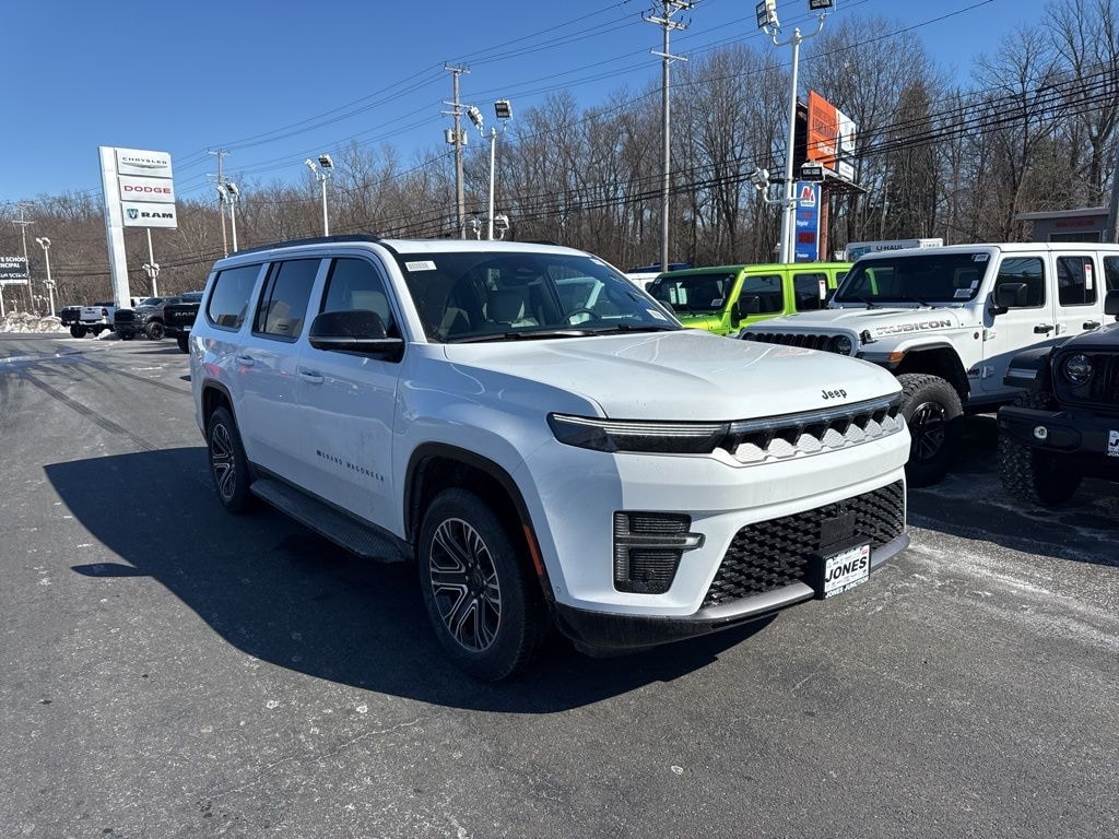 8-Passenger Seating Package (40/20/40 Row Bench Power Tip/Slide, 8-Passenger Seating, and Full Length Floor Console), Premium Group I (3 Panel Sunroof, Auto Adjust in Reverse Exterior Mirrors, Auto Power-Folding Mirrors, Auto-Dimming Exterior Driver Mirror, Auto-Power-Folding Exterior Mirrors, Exterior Mirrors Approach Lamps, Exterior Mirrors with Memory, Exterior Mirrors with Supplemental Signals, Heated Exterior Mirrors, Interior Rear Facing Camera, Luxury Front and Rear Floor Mats, P and P Park and Unpark Assist with Stop System, Reversible Carpet/Vinyl Cargo Mat, Side Distance Warning, and Surround View Camera System), Quick Order Package 29E Grand Wagoneer, 118 MPH Maximum Speed Calibration, 3.55 Rear Axle Ratio, 3rd row seats: bench, 4-Wheel Disc Brakes, 9 Speakers, ABS brakes, Air Conditioning, Alloy wheels, AM/FM radio: SiriusXM with 360L, Anti-whiplash front head restraints, Apple CarPlay/Android Auto, Audio memory, Auto High-beam Headlights, Auto-dimming door mirrors, Auto-dimming Rear-View mirror, Auto-leveling suspension, Automatic temperature control, Black Exterior Accents, Brake assist, Bumpers: body-color, Compass, Delay-off headlights, Driver door bin, Driver vanity mirror, Driver's Seat Mounted Armrest, Dual front impact airbags, Dual front side impact airbags, Electronic Stability Control, Emergency communication system: Jeep Connect, Exterior Parking Camera Rear, Four wheel independent suspension, Front anti-roll bar, Front Bucket Seats, Front Center Armrest w/Storage, Front dual zone A/C, Front fog lights, Front reading lights, Fully automatic headlights, Garage door transmitter, Heated door mirrors, Heated front seats, Heated steering wheel, Illuminated entry, Knee airbag, Low tire pressure warning, Memory seat, Navigation System, Normal Duty Suspension, Occupant sensing airbag, Outside temperature display, Overhead airbag, Overhead console, Panic alarm, Passenger door bin, Passenger seat mounted armrest, Passenger vanity mirror, Power door mirrors, Power driver seat, Power Liftgate, Power passenger seat, Power steering, Power windows, Radio data system, Radio: Uconnect 5 Nav with 12" Display, Rain sensing wipers, Rear air conditioning, Rear anti-roll bar, Rear reading lights, Rear seat center armrest, Rear window defroster, Rear window wiper, Reclining 3rd row seat, Remote keyless entry, Security system, Speed control, Speed-sensing steering, Speed-Sensitive Wipers, Split folding rear seat, Steering wheel memory, Steering wheel mounted audio controls, Tachometer, Telescoping steering wheel, Tilt steering wheel, Traction control, Trip computer, Turn signal indicator mirrors, Variably intermittent wipers, Ventilated front seats, Voltmeter, and Wheels: 20" x 9.0" Machine Face Painted Aluminum.