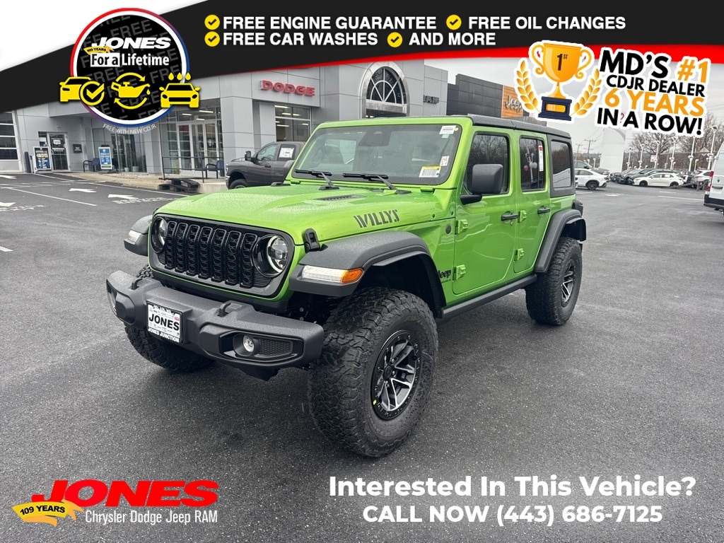Convenience Group (2-Door Passive Entry, Front Door Locks, Air Conditioning with Auto Temp Control, Air Filtering, Cluster 7.0" TFT Color Display, Emergency/Assistance Call, Heated Front Seats, Heated Steering Wheel, and Universal Garage Door Opener), Quick Order Package 24W Willys (4-Wheel Drive Swing Gate Decal, 7 and 4 Pin Wiring Harness, Advanced Brake Assist, Automatic Headlamps, Auxiliary Switches, Black Grille with Gloss Black Rings, Class II Receiver Hitch, Conventional Differential Front Axle, Corning Gorilla Glass, Dana M210 Wide HD Tube Front Axle, Dana M220 Wide Rear Axle, Daytime Running Lamps LED Accents, Deep Tint Sunscreen Windows, E-Locker Rear Axle, Enhanced Adaptive Cruise Control, Front LED Fog Lamps, Full Speed Forward Collision Warning Plus, Injection Molded Black Rear Bumper, LED Premium Reflector Headlamps, Mold in Color Bumper with Gloss Black, Molded in Color Rubicon Highline Flare, MOPAR All-Weather Floor Mats, Off-Road Plus Mode, Power Heated Mirrors, Premium Wrapped Steering Wheel, Security Alarm, Sun Visors with Illuminated Vanity Mirrors, Wheels: 17" x 7.5" Painted Black, Willy's Suspension, and Willys Hood Decal), Safety Group (Auto High Beam Headlamp Control, Blind Spot and Cross Path Detection, LED Taillamps, and ParkSense Rear Park Assist System), Steel Power Dome Hood Package (Power Dome Dual Vented Hood), Xtreme 35 Tire Package (35" Tire Suspension, Anti-Lock 4-Wheel Disc Perf Brakes, MOPAR Hinge-Gate Reinforcement, MOPAR Jack Spacer, MOPAR Tire Relocation Kit, Wheel Flare Extensions, and Wheels: 17" x 8" Machined with Black Pockets), 12.3" Touchscreen Display, 4-Wheel Disc Brakes, 4G LTE Wi-Fi Hot Spot, 8 Speakers, ABS brakes, Air Conditioning, AM/FM radio: SiriusXM with 360L, Apple CarPlay, Apple CarPlay/Android Auto, Aux Battery, Black 3-Piece Hard Top, Brake assist, Compass, Connectivity - US/Canada, Delay-off headlights, Driver door bin, Driver vanity mirror, Dual front impact airbags, Dual front side impact airbags, Electronic Stability Control, For More Info, Call 800-643-2112, Freedom Panel Storage Bag, Front anti-roll bar, Front Bucket Seats, Front Center Armrest w/Storage, Front fog lights, Front reading lights, Google Android Auto, Illuminated entry, Integrated Center Stack Radio, Integrated roll-over protection, Jeep Trail Rated Kit, Low tire pressure warning, No Soft Top, Non-Lock Fuel Cap Without Discriminator, Normal Duty Suspension, Occupant sensing airbag, Outside temperature display, Overhead airbag, Panic alarm, ParkView Rear Back-Up Camera, Passenger door bin, Passenger vanity mirror, Power steering, Power windows, Radio data system, Radio: Uconnect 5 with 12.3" Display, Rear anti-roll bar, Rear reading lights, Rear Window Defroster, Rear Window Wiper/Washer, Remote keyless entry, SiriusXM Radio Service, SiriusXM with 360L, Speed control, Split folding rear seat, Steering wheel mounted audio controls, Stop-Start Dual Battery System, Tachometer, Telescoping steering wheel, Tilt steering wheel, Traction control, Trip computer, Variably intermittent wipers, and Wheels: 17" x 7.5" Black Steel Styled.