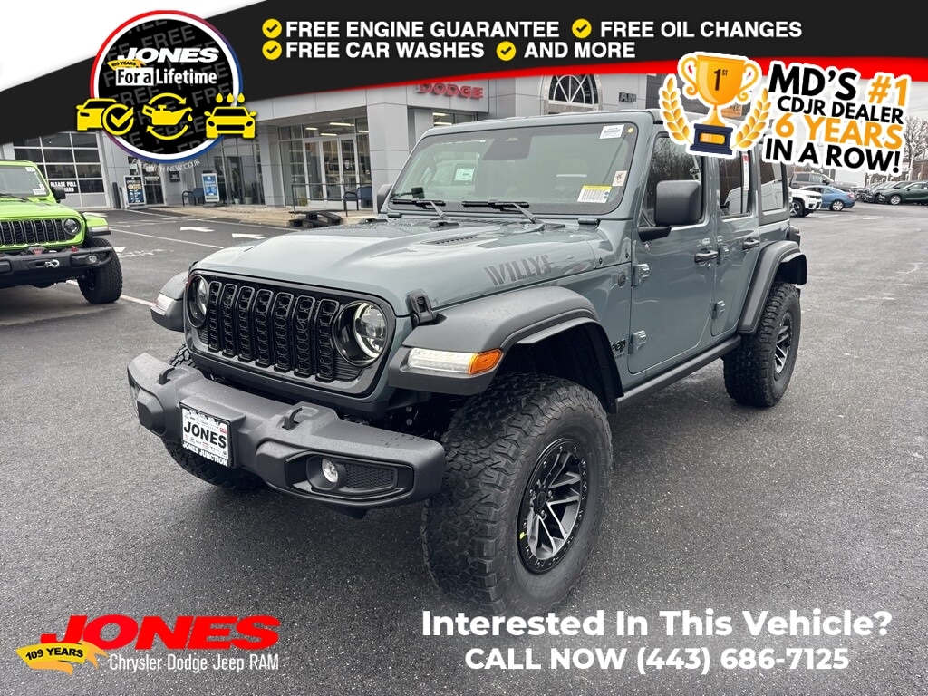 Convenience Group (2-Door Passive Entry, Front Door Locks, Air Conditioning with Auto Temp Control, Air Filtering, Cluster 7.0" TFT Color Display, Emergency/Assistance Call, Heated Front Seats, Heated Steering Wheel, and Universal Garage Door Opener), Quick Order Package 24W Willys (4-Wheel Drive Swing Gate Decal, 7 and 4 Pin Wiring Harness, Advanced Brake Assist, Automatic Headlamps, Auxiliary Switches, Black Grille with Gloss Black Rings, Class II Receiver Hitch, Conventional Differential Front Axle, Corning Gorilla Glass, Dana M210 Wide HD Tube Front Axle, Dana M220 Wide Rear Axle, Daytime Running Lamps LED Accents, Deep Tint Sunscreen Windows, E-Locker Rear Axle, Enhanced Adaptive Cruise Control, Front LED Fog Lamps, Full Speed Forward Collision Warning Plus, Injection Molded Black Rear Bumper, LED Premium Reflector Headlamps, Mold in Color Bumper with Gloss Black, Molded in Color Rubicon Highline Flare, MOPAR All-Weather Floor Mats, Off-Road Plus Mode, Power Heated Mirrors, Premium Wrapped Steering Wheel, Security Alarm, Sun Visors with Illuminated Vanity Mirrors, Wheels: 17" x 7.5" Painted Black, Willy's Suspension, and Willys Hood Decal), Safety Group (Auto High Beam Headlamp Control, Blind Spot and Cross Path Detection, LED Taillamps, and ParkSense Rear Park Assist System), Steel Power Dome Hood Package (Power Dome Dual Vented Hood), Xtreme 35 Tire Package (35" Tire Suspension, Anti-Lock 4-Wheel Disc Perf Brakes, MOPAR Hinge-Gate Reinforcement, MOPAR Jack Spacer, MOPAR Tire Relocation Kit, Wheel Flare Extensions, and Wheels: 17" x 8" Machined with Black Pockets), 12.3" Touchscreen Display, 4-Wheel Disc Brakes, 4G LTE Wi-Fi Hot Spot, 8 Speakers, ABS brakes, Air Conditioning, AM/FM radio: SiriusXM with 360L, Apple CarPlay, Apple CarPlay/Android Auto, Aux Battery, Black 3-Piece Hard Top, Brake assist, Compass, Connectivity - US/Canada, Delay-off headlights, Driver door bin, Driver vanity mirror, Dual front impact airbags, Dual front side impact airbags, Electronic Stability Control, For More Info, Call 800-643-2112, Freedom Panel Storage Bag, Front anti-roll bar, Front Bucket Seats, Front Center Armrest w/Storage, Front fog lights, Front reading lights, Google Android Auto, Illuminated entry, Integrated Center Stack Radio, Integrated roll-over protection, Jeep Trail Rated Kit, Low tire pressure warning, No Soft Top, Non-Lock Fuel Cap Without Discriminator, Normal Duty Suspension, Occupant sensing airbag, Outside temperature display, Overhead airbag, Panic alarm, ParkView Rear Back-Up Camera, Passenger door bin, Passenger vanity mirror, Power steering, Power windows, Radio data system, Radio: Uconnect 5 with 12.3" Display, Rear anti-roll bar, Rear reading lights, Rear Window Defroster, Rear Window Wiper/Washer, Remote keyless entry, SiriusXM Radio Service, SiriusXM with 360L, Speed control, Split folding rear seat, Steering wheel mounted audio controls, Stop-Start Dual Battery System, Tachometer, Telescoping steering wheel, Tilt steering wheel, Traction control, Trip computer, Variably intermittent wipers, and Wheels: 17" x 7.5" Black Steel Styled.