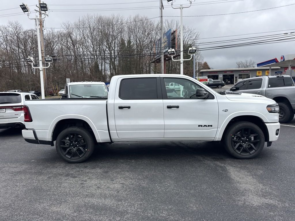 Bed Utility Group (Exterior 115V AC Outlet, MOPAR 4 Adjustable Cargo Tie-Down Hooks, and MOPAR Spray in Bedliner), Laramie Level 1 Equipment Group (Rain Sensitive Windshield Wipers and Remote Tailgate Release), Night Edition (Accent Color Door Handles, Accent Color Premium Power Mirrors, Accent Color Tailgate Handle, Anti-Spin Differential Rear Axle, Auto Power-Folding Mirrors, Auto-Dimming Exterior Driver Mirror, Black Exterior Truck Badging, Black Headlamp Bezels, Black Interior Accents, Black Painted Exterior Mirrors Caps, Black Tail Lamp Bezels, Body Color Front Bumper, Body Color Rear Bumper with Step Pads, Convex Wide-Angle Exterior Mirror Insert, Dual Exhaust with Black Tips, Exterior Mirrors Approach Lamps, Exterior Mirrors Courtesy Lamps, Exterior Mirrors with Heating Element, Exterior Mirrors with Memory, Exterior Mirrors with Supplemental Signals, Grille Surround 3 Black Texture 2 Black, Pirelli Brand Tires, Proximity Approach/Departure Lamps, RAM Grille Badge - Black, Sport Performance Hood, and Wheels: 22" x 9" Forged Aluminum), Quick Order Package 27H Laramie, 10 Speakers, 33 Gallon Fuel Tank, 4-Wheel Disc Brakes, 4G LTE Wi-Fi Hot Spot, ABS brakes, Active Noise Control System, Adjustable pedals, Air Conditioning, Alloy wheels, AM/FM radio: SiriusXM with 360L, Apple CarPlay/Android Auto, Audio memory, Auto High-beam Headlights, Auto-dimming door mirrors, Auto-dimming Rear-View mirror, Automatic temperature control, Brake assist, Bumpers: chrome, Chrome Exterior Mirrors, Compass, Connected Travel and Traffic Services, Connectivity - US/Canada, Delay-off headlights, Dome Dual LED Reading Lamp, Driver door bin, Driver vanity mirror, Dual front impact airbags, Dual front side impact airbags, Dual-Pane Panoramic Sunroof, Electronic Stability Control, Front anti-roll bar, Front Bucket Seats, Front Center Armrest w/Storage, Front dual zone A/C, Front fog lights, Front License Plate Bracket, Front reading lights, Front wheel independent suspension, Fully automatic headlights, Garage door transmitter, GPS Navigation, Heated door mirrors, Heated front seats, Heated rear seats, Heated steering wheel, Illuminated entry, Integrated Center Stack Radio, Integrated Voice Command with Bluetooth, Leather steering wheel, Leather Trimmed Bucket Seats, LED Dome/Reading Lamp, Low tire pressure warning, Memory seat, MOPAR Front and Rear Rubber Floor Mats, MyFlexCare Service Plan, Navigation System, Occupant sensing airbag, Off-Road Information Pages, Outside temperature display, Overhead airbag, Overhead console, Panic alarm, ParkView Rear Back-Up Camera, Passenger door bin, Passenger vanity mirror, Pedal memory, Power door mirrors, Power driver seat, Power passenger seat, Power steering, Power windows, Radio data system, Radio: Uconnect 5 Navigation with 12.0" Display, RAM Grille Badge - Chrome, Rear anti-roll bar, Rear reading lights, Rear seat center armrest, Rear step bumper, Rear Wheelhouse Liners, Remote keyless entry, Security system, SiriusXM Radio Service, SiriusXM with 360L, Speed control, Split folding rear seat, Steering wheel mounted audio controls, Tachometer, Telescoping steering wheel, Tilt steering wheel, Traction control, Trailer Brake Control, Trip computer, Turn signal indicator mirrors, USB Host Flip, Variably intermittent wipers, Ventilated front seats, Voltmeter, and Wheels: 20" x 9" Premium Paint/Polish.